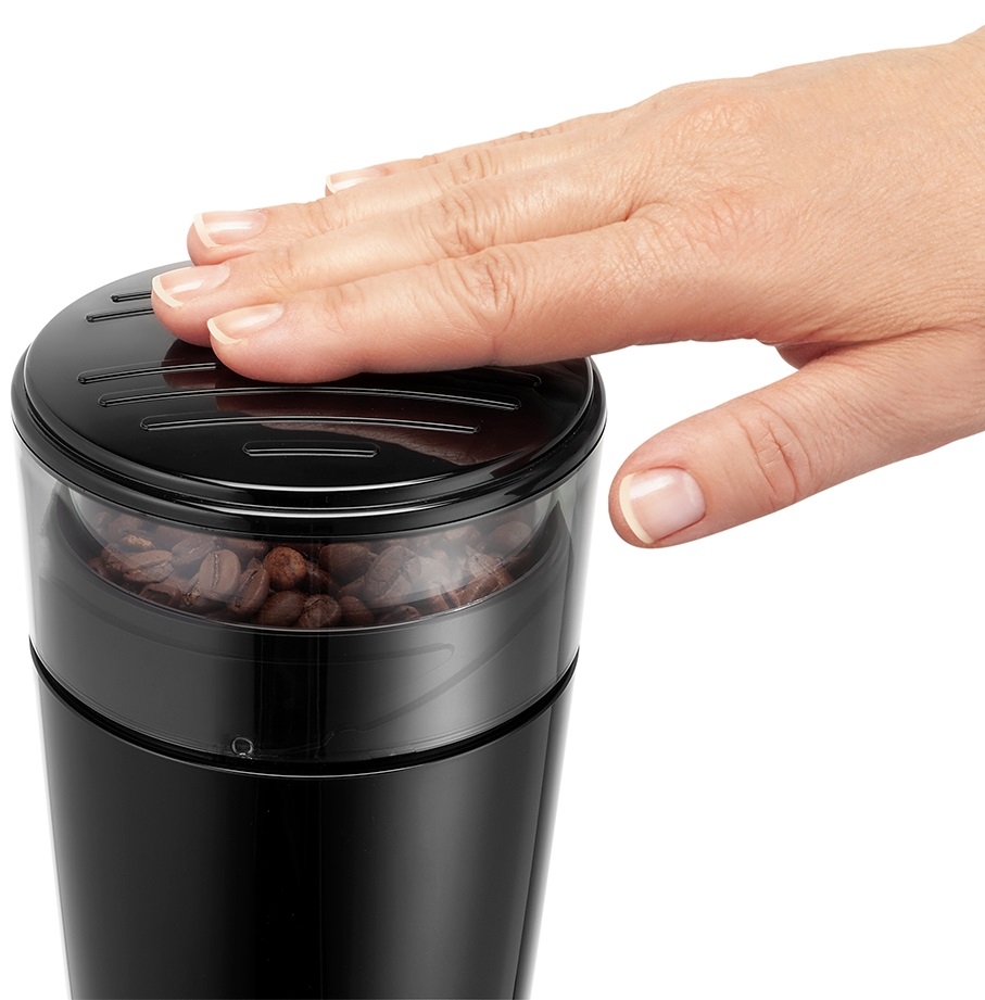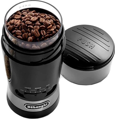 Кофемолка DeLonghi KG210 оснащена электрическим мотором мощностью 170 Вт.Данная модель также оснащена прочным ротационным ножом. Чтобы включить кофемолку, необходимо лишь нажать на крышку. Устройство может измельчить кофейные специи, зерна и сахар, а объем чаши составляет 90 г, и этого вполне достаточно для приготовления любимого напитка на десять небольших чашек.