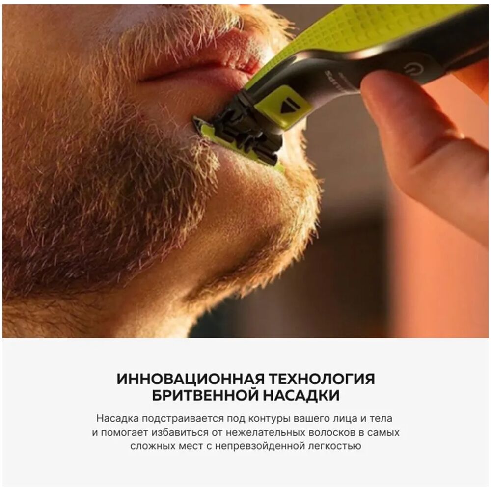 Триммер Philips QP2724/10 для создания причесок, оформления контуров и щетины оснащен насаженной бритвенной головкой с лезвием OneBlade из нержавеющей стали, ножи которого совершают до 200 движений в секунду и справляются с волосками любой жесткости. Инструмент в пластиковом корпусе длиной около 180 мм и шириной 40 мм поддерживает сухое и влажное бритье. Скользящее покрытие в сочетании с закругленными кончиками обеспечивает высокую точность манипуляций и мягко повторяет контуры тела. Кнопка на корпусе отвечает за переключение между рабочим и нерабочим состоянием. Нескользящая рукоятка удобна для захвата.