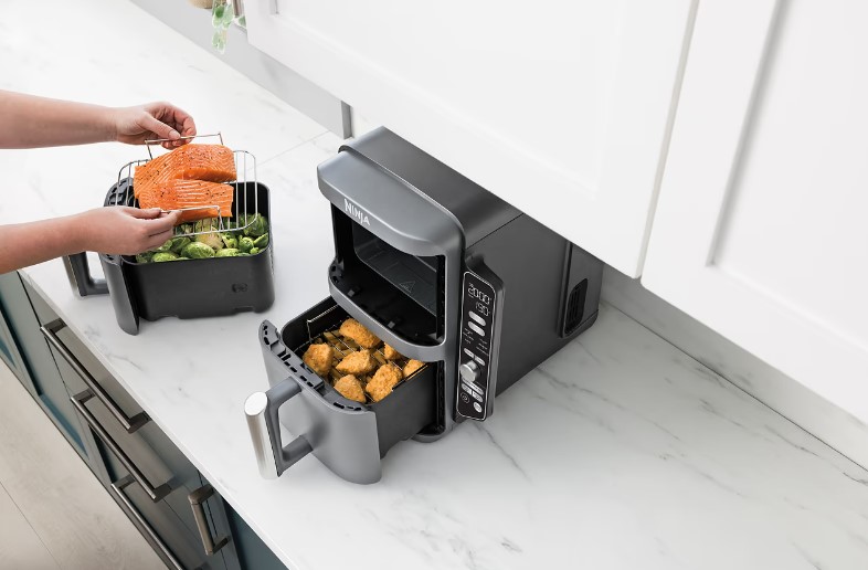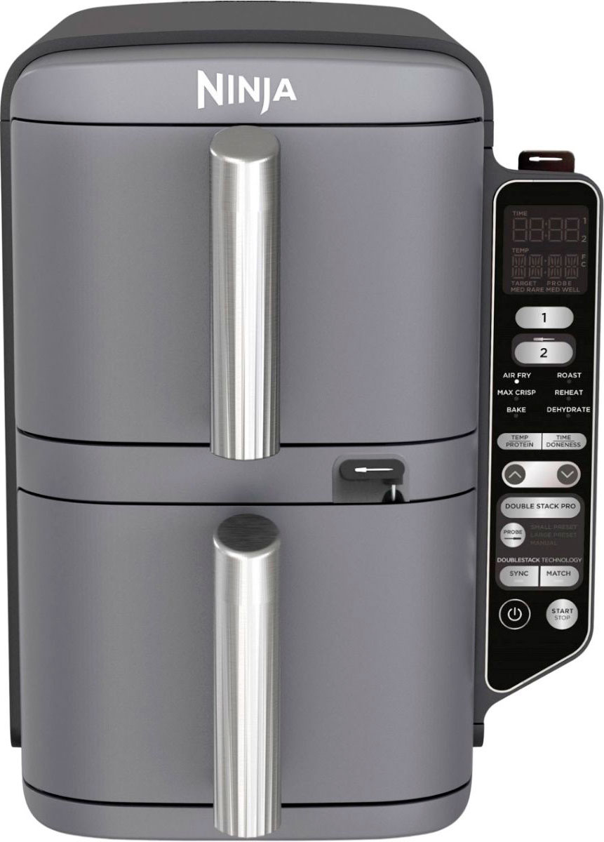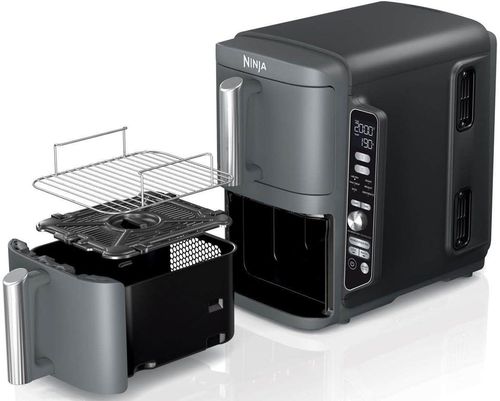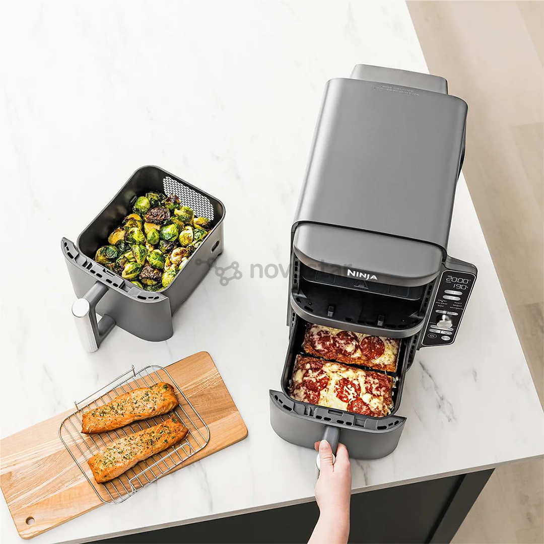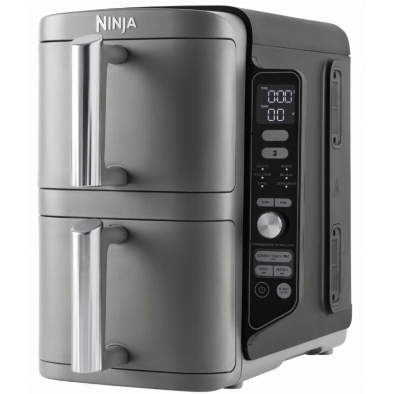 Аэрогриль Ninja Foodi Double Stack XL SL400 — это компактная модель с двумя вертикально расположенными чашами общим объемом 9,5 литров, которая позволяет готовить до четырех блюд одновременно на разных уровнях. Благодаря своей конструкции она занимает на 30% меньше места на столе по сравнению с классическими моделями с двумя горизонтальными корзинами.