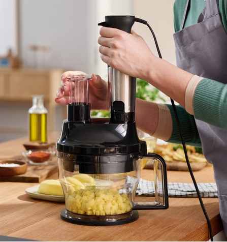 Вам нравятся домашние картофельные оладьи, часто нужны кубики или ломтики? Насадка для кухонного комбайна превращает ваш ручной блендер в универсальный кухонный инструмент. Универсальный помощник идеально подходит для измельчения, замешивания нарезки ломтиками икубиками. Всегда под рукой, легко хранить и чистить.
