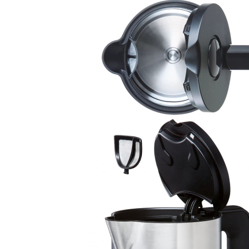 Чайник выполнен из металла и пластика, что обеспечивает его долговечность и надежность. В комплекте с чайником идет фильтр из нержавеющей стали, предотвращающий попадание накипи в напиток.