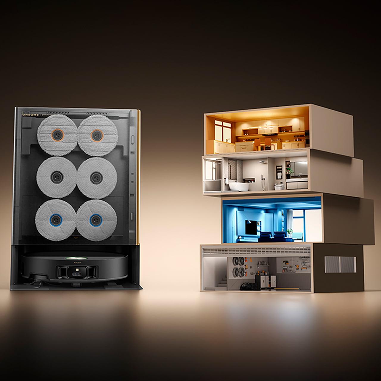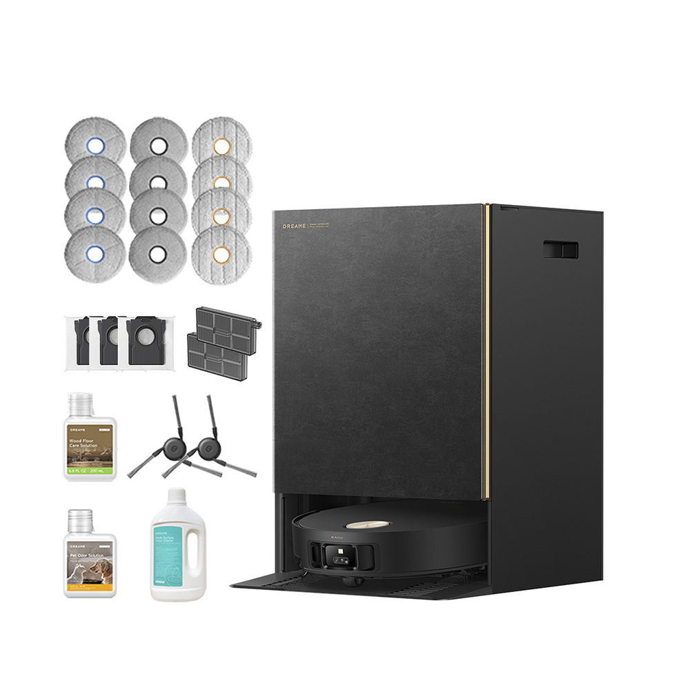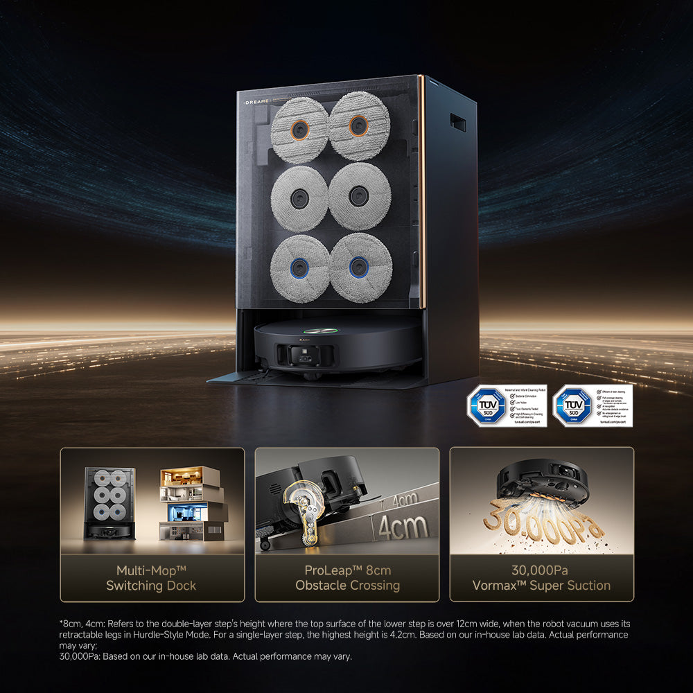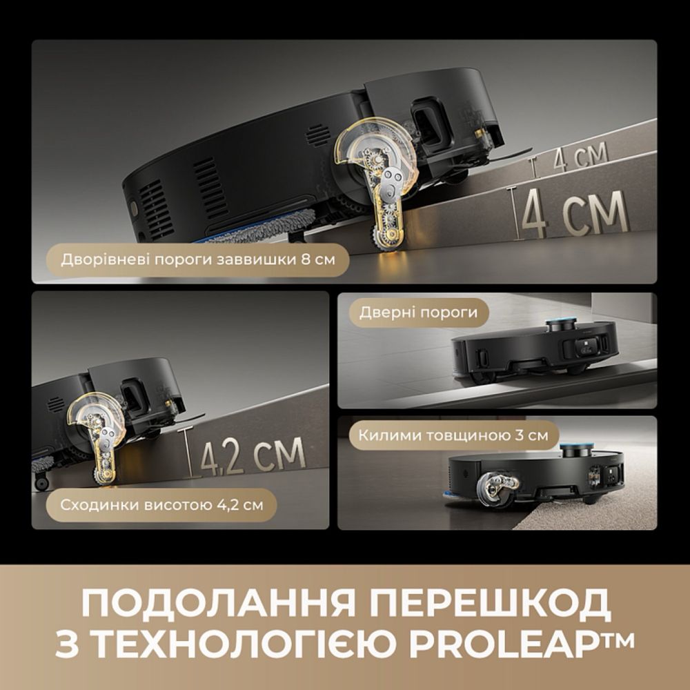 - Дополнительная информация: автоматическая смена швабр, автоматическая очистка швабр с помощью горячей воды, сушка горячим воздухом, голосовое управление, автоматическая заправка чистящим средством для промывки швабр и мытья полов, поддержка протокола Matter, сохранение карт 4 этажей, регулировка мощности всасывания на ковре, регулировка расхода воды, интеллектуальная система объезда препятствий 3DAdapt, преодоление препятствий высотой до 8 см, выдвижная система DToF, система HyperStream с двумя щётками для предотвращения спутывания волос, три отсека для специальных жидких чистящих средств, RGB-камера с ИИ и 3D-сканирование на основе структурированного света, режим поиска домашних животных, фотосъёмка домашних животных и голосовое взаимодействие с ними, автоматическое создание видеоблога о домашних животных, самоочищающийся поддон для мытья швабр, возможность подключить к водопроводу (комплект для подключения приобретается отдельно)