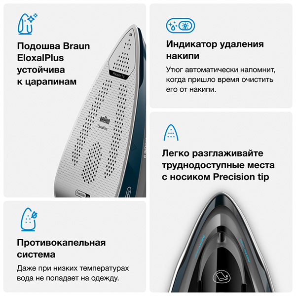 Утюг Braun SI9682DB сочетает высокую производительность с продуманной эргономикой. Подошва Eloxal Plus легко скользит по любой ткани, а вертикальное отпаривание и мощный паровой удар до 260 г/мин справляются даже с плотными материалами. Постоянная подача пара — 60 г/мин, объём резервуара — 0.3 л.