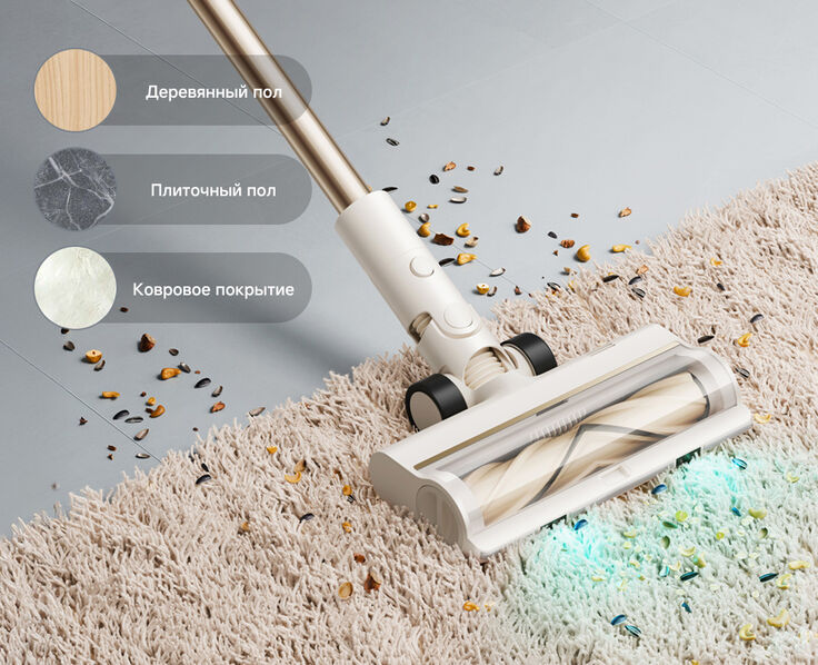Щётка с подсветкой помогает видеть мельчайшие загрязнения даже под мебелью или в тёмных углах. Световой индикатор пыли срабатывает, когда устройство обнаруживает загрязнение, что позволяет не пропустить ни одной пылинки. При этом пылесос работает достаточно тихо — уровень шума составляет всего 85дБ, что делает его комфортным в использовании даже в утренние часы.